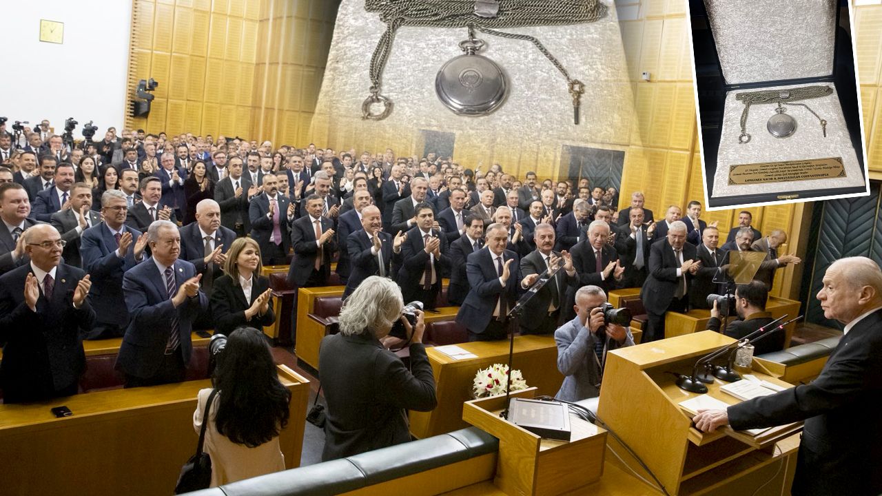 MHP İl Başkanı Adem Yurdagül, grup toplantısı çıkışında Genel Başkan Devlet Bahçeli’nin elini öptü, 160 yıl önce İsviçre’de Osmanlı için özel olarak yapılmış, antika olarak kabul edilen Longines marka ‘köstekli saat’ hediye etti.