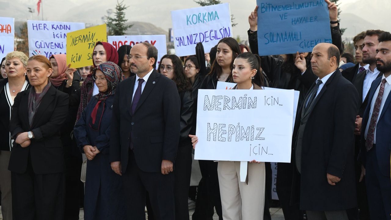 Rektörlük meydanında konuşan Çakmak, kadına yönelik şiddetin ciddi bir toplumsal sorun olduğunu vurgulayarak: “Bugün burada, üniversitemizin ve şehrimizin kalbinde derin bir yara açan, hepimizi sarsan büyük bir kaybın ardından bir araya gelmiş bulunuyoruz. Üniversitemizin değerli çalışanlarından Nermin Tirit, 3 Kasım 2025 sabahı evinin önünde uğradığı silahlı saldırı sonucu yaşamını yitirmiştir. Bu acı olay hem üniversitemiz camiasında hem de toplum genelinde büyük bir üzüntü ve teessüre yol açmıştır. Hiçbir gerekçe, bir kadının yaşam hakkını elinden almaya mazeret olamaz. Erzurum Teknik Üniversitesi olarak, insan yaşamının kutsallığına ve temel hakların dokunulmazlığına olan inancımız tamdır. Kadına yönelik şiddetin her türlüsüne karşı sıfır tolerans ilkesini kararlılıkla uyguluyor; fiziksel, psikolojik, ekonomik veya dijital ortamda gerçekleşen her türlü şiddeti reddediyor ve en güçlü şekilde kınıyoruz” ifadelerini kullandı.
