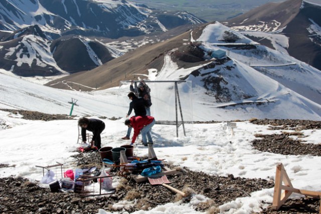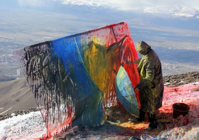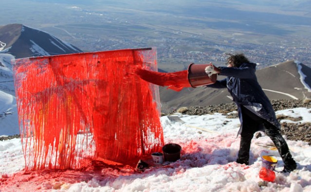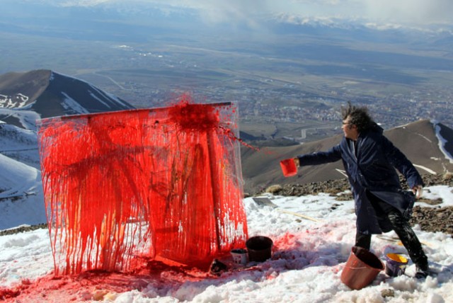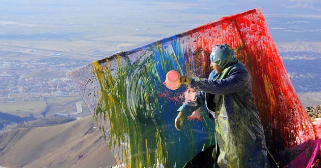 Atatürk Üniversitesi Güzel Sanatlar Fakültesi Dekanı Prof. Dr. Mehmet Kavukcu, sanatın etki alanındaki diline dikkat çekmek için Erzurum’un 3 bin 100 metre ile en yüksek noktası olan Ejder Tepesinde, boya, kar ve şemsiyelerle sıra dışı bir sanat performansında bulundu.