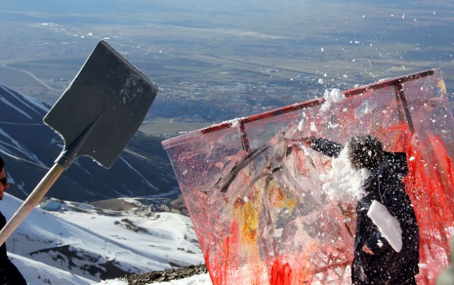 Daha önceki yıllarda araçları buzla kaplayarak, renkli balon ve şemsiyelerle mekanları donatarak dikkat çekici sanat çalışmalarına imza atan sanatçı ve Atatürk Üniversitesi Güzel Sanatlar Fakültesi Dekanı Prof. Dr. Mehmet Kavukcu, bu seferde zirvede sanat performansı yaptı. Kentteki ajans muhabir ve kameramanlarıyla birlikte zorlu bir yolculuğa çıkan Kavukçu, Palandöken’den Ejder Tepesine kar üstü araçlarıyla gitti. Erzurum’un tepeden kuşbakışı görüldüğü Ejder Tepesinde, Prof. Dr. Mehmet Kavukcu, sanat performansını sergiledi. İki ucunu demirlere tutturduğu yaklaşık 5 metre karelik şeffaf jelatini boyayan ve kar serperek değişik figürler oluşturan Kavukçu, daha sonra öğrencilerine kendi üzerine önce kar sonra da boya serptirdi. Tamamen boya altında kalan, suratı ve üzerindeki giysileri tamamen boyanan Kavukçu, bunu yapmaktaki amacının sanatın etki alanındaki diline dikkat çekmek olduğunu belirtti.