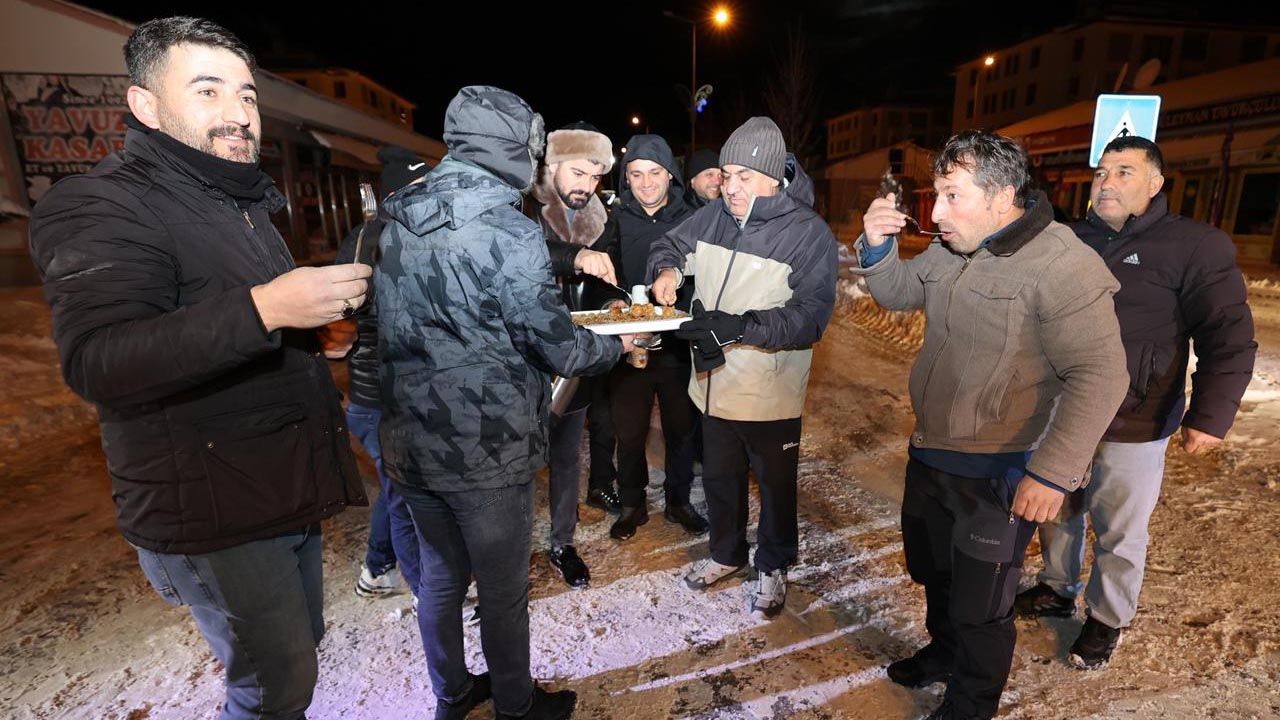 Yoğun kar yağışının ilçedeki araç ve yaya trafiğini aksatmaması için yoğun bir tempoyla çalışan belediye işçilerine sahada baklava ve çay ikram eden Aziziye Belediye Başkanı Akpunar, karla mücadele çalışmalarına sabahın ilk ışıklarına kadar eşlik etti.